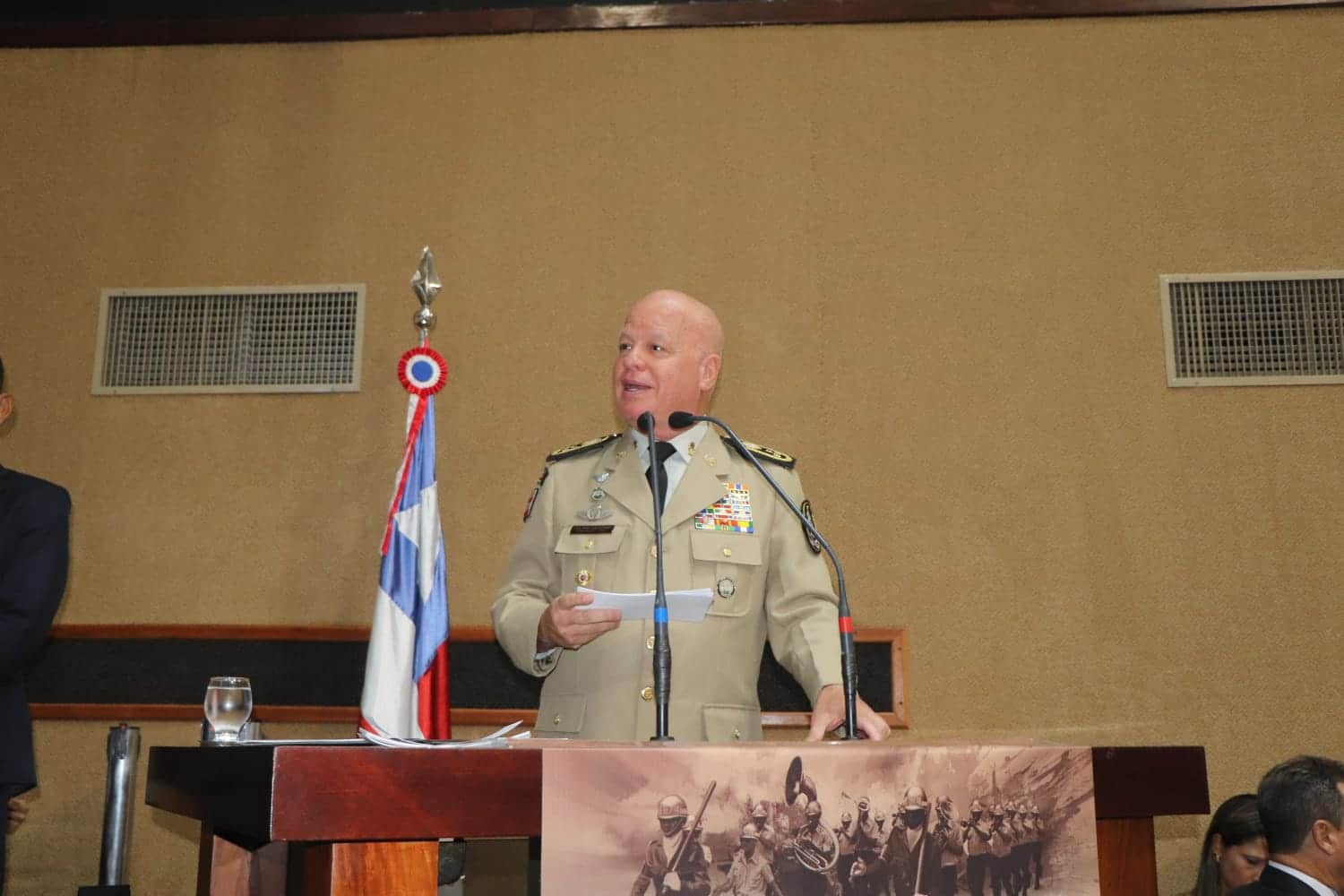O secretário da segurança pública, Marcelo Werner, foi representado pelo chefe de gabinete da SSP, Daniel Madruga, que leu a mensagem do chefe da pasta. “Uma das mais antigas e respeitadas do Brasil, a PMBA tem uma trajetória marcada por bravura, compromisso e resiliência. Protagonizou momentos históricos e sempre atuou com firmeza e lealdade aos princípios institucionais. Segurança pública não se faz apenas com polícia, mas com cidadania, educação, cultura e políticas sociais inclusivas”.